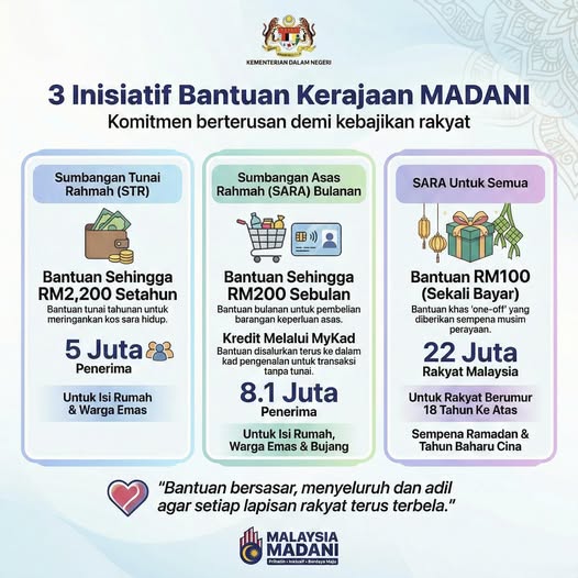 Kerajaan MADANI terus komited memastikan kebajikan rakyat sentiasa menjadi keutamaan melalui pelaksanaan 3 Inisiatif Bantuan Kerajaan MADANI yang bersasar, menyeluruh dan inklusif.