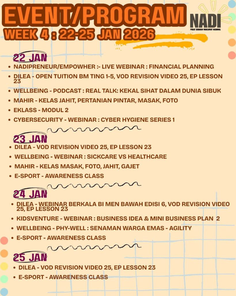Program Perkhidmatan Pintar NADI minggu ni memang fokus untuk upgrade diri kita. Tengok je la semua aktiviti bermula Khamis (22 Jan) sampai Ahad (25 Jan) ni.